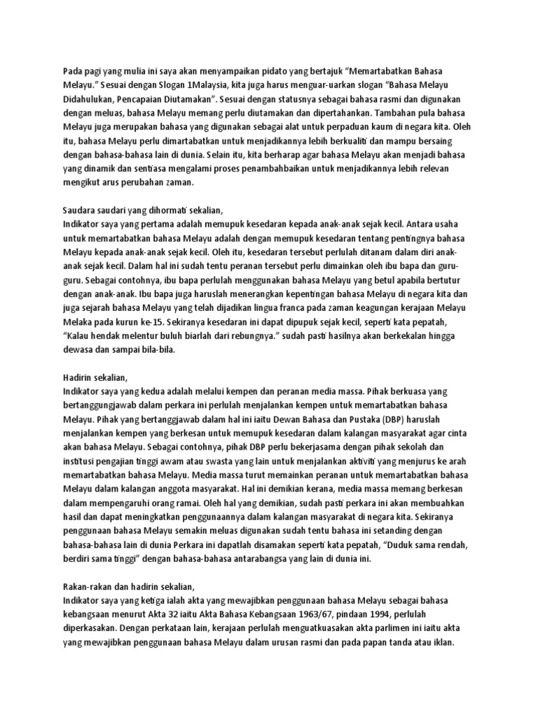 F1 bahasa melayu sebagai bahasa kebangsaan. Bahasa melayu telah mengalami proses perkembangan yang begitu pesat. Cara itulah yang terbaik untuk memartabatkan bahasa malaysia yang ternyata memberikan faedah yang besar kepada perpaduan rakyat dan teknologi malaysia. Cara dan langkah memartabatkan bahasa malaysia. Mewujudkan akta untuk memartabatkan bahasa melayu seperti : Kesimpulannya, penggunaan bahasa rojak dan bahasa singkatan yang berleluasa telah mencemari martabat bahasa melayu sebagai bahasa kebangsaan negara kita. Langkah pemasaran yang agresif, seperti yang dilakukan oleh masyarakat cina, ialah cara terbaik untuk mengekalkan kesenian dan bahasa melayu. Bahasa melayu juga merupakan bahasa pengantar utama pendidikan berdasarkan Mewajibkan penggunaan bahasa melayu dalam urusan rasmi dan pada papan tanda atau iklan. Pensyarah fakulti kejuruteraan dan alam bina ukm, prof. Sejak kebelakangan ini, ramai orang malu untuk menggunakan bahasa ibunda kami iaitu bahasa melayu. Memartabatkan bahasa melayu, memantapkan bahasa inggeris: Menurut kamus pelajar, melestarikan bermakna membiarkan atau memelihara sesuatu supaya kekal seperti sediakala.